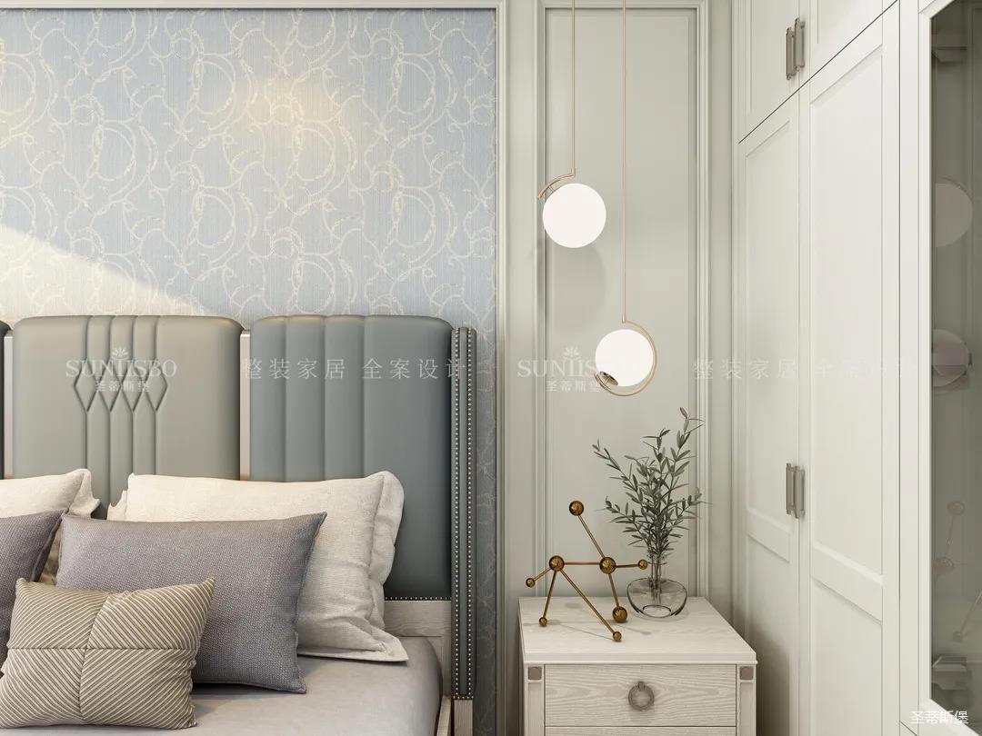 轻盈而明亮的实木饰面与超大落地窗,给次卧空间带来了明朗的空间视野,莫兰迪色彩交叠出最时尚的空间底色。定制衣柜对称开合让空间秩序规律又齐整,护墙选择了浅蓝色打底,虽是美式风格,颜色却没有美式的厚重感,印花贴合着床屏,流线简练利落,以简致的维度诠释着美式雅致的舒适生活。